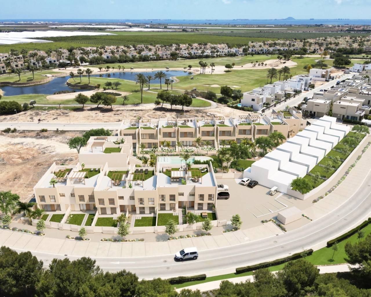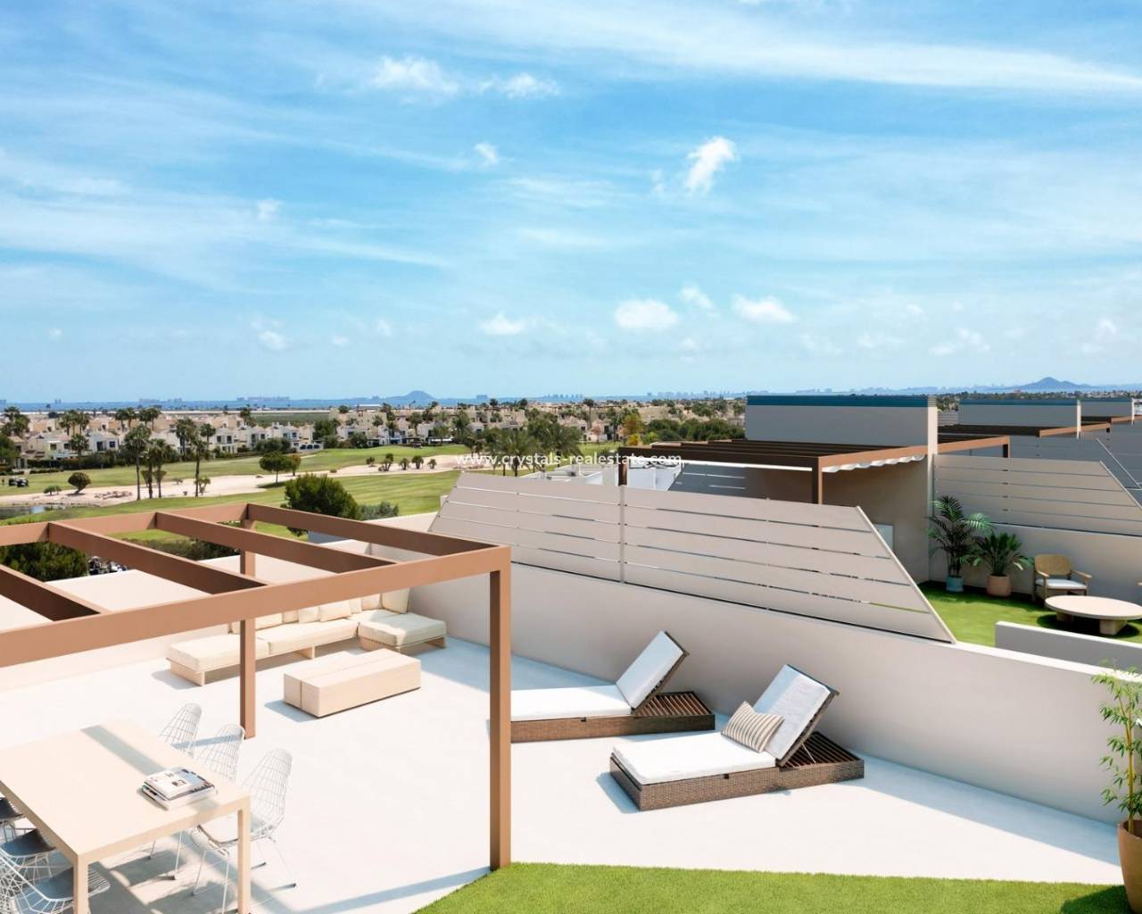 NEU GEBAUTE BUNGALOWS IN RODA GOLF Die neue Wohnanlage befindet sich auf einem nach Süden ausgerichteten Grundstück im renommierten Roda Golf & Beach Resort, das an den Golfplatz mit seinen gepflegten Fairways und Seen grenzt. Dieser wunderschöne Komplex besteht aus 37 geräumigen Häusern, die einen herrlichen Pool und Gemeinschaftsgärten umgeben. Diese moderne Wohnanlage bietet eine Reihe von Immobilientypen, Aussichten und Ausrichtungen, je nach Ihren Bedürfnissen. Alle Bungalow-Wohnungen verfügen über 3 Doppelschlafzimmer, 2 Bäder, ein helles und geräumiges offenes Wohn-Esszimmer mit amerikanischer Küche und einen fantastischen Außenbereich. Alle Bungalows verfügen über einen Parkplatz abseits der Straße und einen privaten Abstellraum. Die 18 Bungalows im Erdgeschoss verfügen über eine Innenterrasse und einen Garten, die zu den Gemeinschaftsgärten und dem Poolbereich führen, sowie über eine große, eingezäunte Terrasse und einen Garten auf der Rückseite. Die 18 Penthäuser verfügen über einen vorderen Balkon vor dem Wohnzimmer sowie über eine fantastische, 90 m2 große private Dachterrasse mit Sommerküche. Die Wohnanlage wurde so konzipiert, dass Raum und Licht optimal genutzt werden. Dieses exklusive Angebot ist eine echte Oase an der spanischen Costa Calida, hervorragend gebaut und mit einer Vielzahl von Extras ausgestattet. Das Herzstück der Anlage ist ein herrlicher Gemeinschaftspool, der von mediterraner Vegetation umgeben ist. Dank seiner Südausrichtung genießt er den ganzen Tag über die Sonne und ist der perfekte Ort, um zu schwimmen, zu entspannen und die Sonne Murcias aufzusaugen. Die Wohnungen im Erdgeschoss verfügen nicht nur über einen fantastischen Innenraum, sondern auch über eine schöne vordere Terrasse und einen zusätzlichen privaten Garten, der in das Innere der Wohnanlage mit ihren herrlichen Gemeinschaftsgärten und dem Poolbereich führt. Darüber hinaus bieten sie eine hintere Terrasse und einen eingezäunten Garten für maximale Privatsphäre, mit einem Tor, das zum Außenbereich der Urbanisation führt. Die doppelte Ausrichtung sorgt dafür, dass die Häuser den ganzen Tag über Sonne und Schatten genießen. Ein wunderschön gepflegter, von Dave Thomas entworfener 18-Loch-Platz mit Seen, strategisch platzierten Bunkern, hügeligen Grüns und üppiger mediterraner Vegetation. Ein privates Resort mit 24-Stunden-Sicherheitsdienst, eigenem Taxistand, einem beeindruckenden Clubhaus mit A-la-carte-Restaurant, Fitnessraum mit Seeblick und Sportbereich. Und das alles nur einen Spaziergang oder eine Radtour entfernt von den Stränden und dem ruhigen Wasser der Binnenlagune Mar Menor. Diese Wohnanlage hat eine fantastische Auswahl an goldenen Sandstränden vor der Haustür und bietet eine breite Palette an Wassersportmöglichkeiten. Genießen Sie sowohl das Mar Menor als auch das Mittelmeer von diesem Paradies an der Küste Murcias aus.