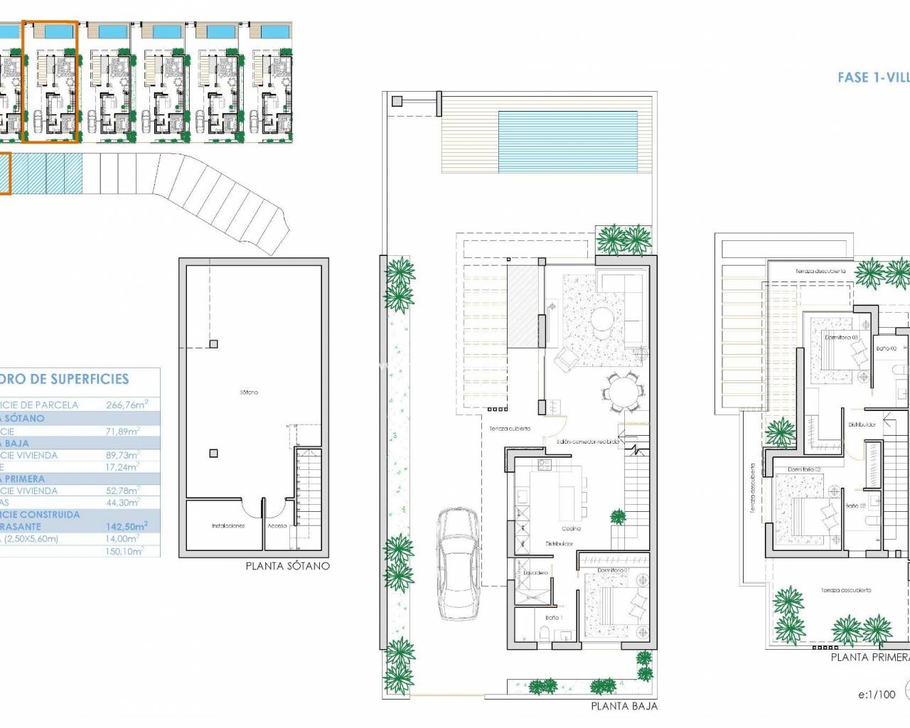 NEUBAU-VILLEN IN PRIVATER GARTENANLAGE IN DER PROVINZ MURCIA Neubauvillen in privater, geschützter Anlage in der Region Murcia, umgeben von hervorragenden Golfplätzen und nur 10 Minuten von den Sandstränden des Mar Menor entfernt. Villen bauen über 3 Etagen und verfügt über 3 Schlafzimmer, 3 Bäder, offene Küche und Wohn-Esszimmer, Einbauschränke, Keller, privaten Garten mit dem Pool und Parkplatz. Sie befinden sich in einer privaten, bewachten Anlage mit einem Haupteingang und 24 Stunden Sicherheitsdienst. Die Anlage ist um eine beeindruckende 126.000 m2 große Grünfläche herum angelegt. Sie umfasst Wander- und Radwege, Sportanlagen, Paddel- und Tennisplätze, einen Minigolfplatz, Gärten, Hundeparks, Freizeitbereiche, ein Clubhaus.... Ebenfalls im zentralen Bereich befindet sich das Juwel des Resorts, ein kristallklarer künstlicher See mit einer Wasserfläche von fast 17.000 m2, umgeben von weißen Sandstränden und Palmen, der ein Stück Karibik in die Region Murcia bringt. Es gibt 2 Inseln im See, eine davon mit einer eigenen Bar, außerdem gibt es "Strand-Chiringuitos" rund um den See. Die Anlage ist strategisch günstig gelegen, weniger als 4 km vom Strand und der Stadt Los Alcázares entfernt, wo man verschiedene Wassersportarten ausüben kann, umgeben von mehreren Golfplätzen und der Stadt Cartagena, die weniger als 15 Autominuten und 22 km vom Flughafen Murcia entfernt ist, so dass man ein breites kulturelles, gastronomisches und sportliches Angebot in Reichweite hat.