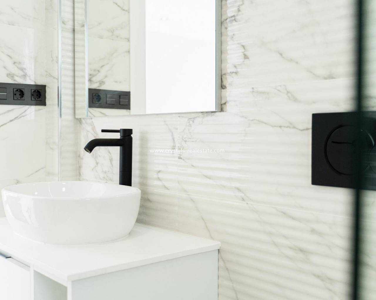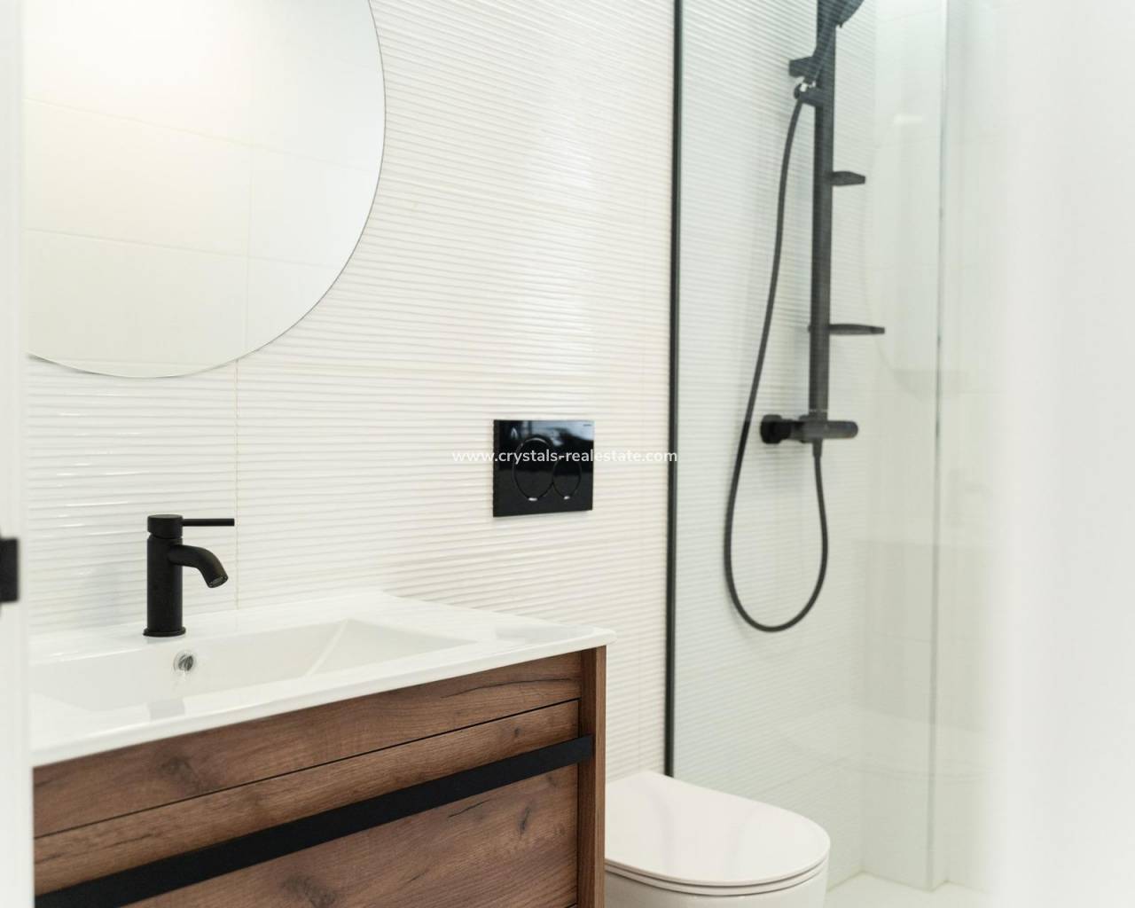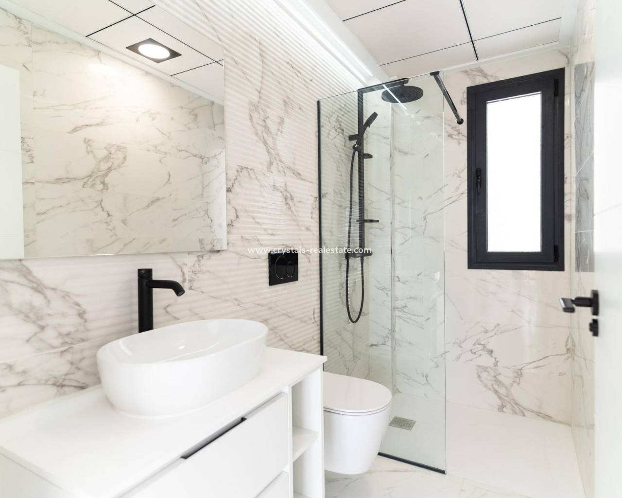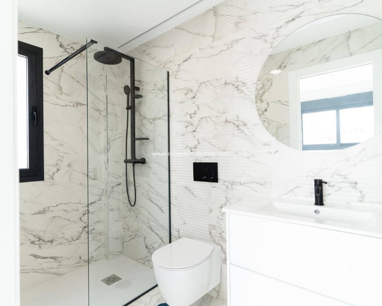 NEU GEBAUTE WOHNANLAGE IN PUNTA PRIMA Neubau-Wohnanlage mit Bungalow-Apartments und 7 freistehenden Villen in Punta Prima. Die Neubauvillen verteilen sich auf zwei Etagen, plus der sonnigen Dachterrasse. Im Erdgeschoss befindet sich ein helles und geräumiges Wohnzimmer mit offener Küche, 1 Schlafzimmer mit Einbauschrank und 1 Badezimmer. Im ersten Stock befinden sich 3 weitere Schlafzimmer mit Einbauschränken und 2 Bäder, davon eines en-suite mit dem Hauptschlafzimmer. Vom Hauptschlafzimmer aus hat man Zugang zu einer Terrasse. Eine Treppe hinauf erreichen Sie eine private Sonnenterrasse. Die Urbanisation wird schöne Grünflächen mit einem Spielplatz für Kinder, ein Fitnessstudio und zwei Gemeinschaftspools bieten. Der Komplex liegt nur wenige Meter vom Zentrum von Punta Prima entfernt, wo Sie alle Annehmlichkeiten finden, die Sie benötigen. In der Umgebung finden Sie eine breite Palette von netten Restaurants, Cafés, Supermärkte, Apotheken und alle Annehmlichkeiten, die Sie benötigen. Punta Prima, nur 5 km von Torrevieja entfernt, zeichnet sich durch eine gute Kommunikations- und Gesundheitsinfrastruktur, die Nähe zum Flughafen Alicante und die vielen ganzjährig geöffneten Dienstleistungsbetriebe aus. Nur 10 km entfernt befinden sich die Golfplätze von Villamartín, Campoamor, Las Ramblas, Las Colinas und Lo Romero sowie die Einkaufszentren von La Zenia und Habaneras.