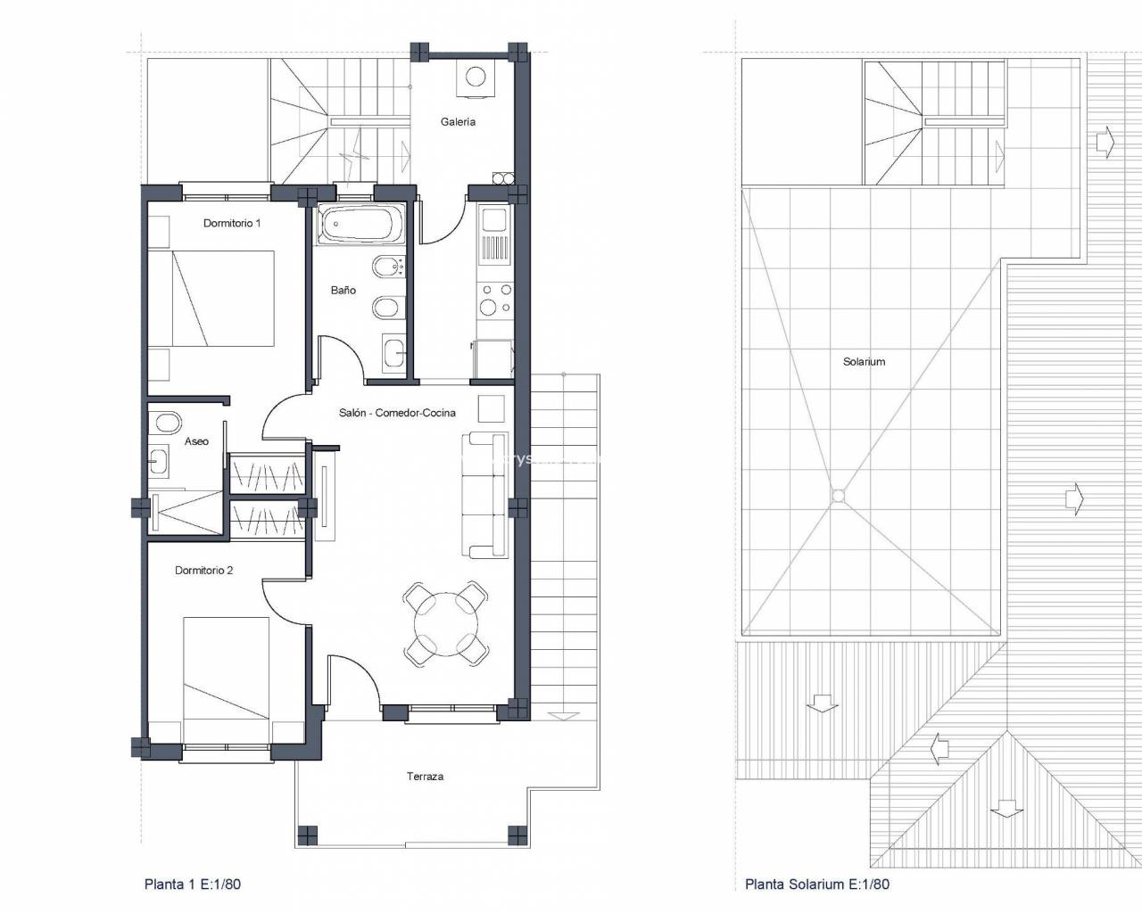 Bungalows: Einheiten im Untergeschoss mit eigenem Garten oder im Obergeschoss mit Sonnenterrasse, jeweils mit 2 Schlafzimmern, 2 Bädern und Split-Klimaanlage im Wohnzimmer.