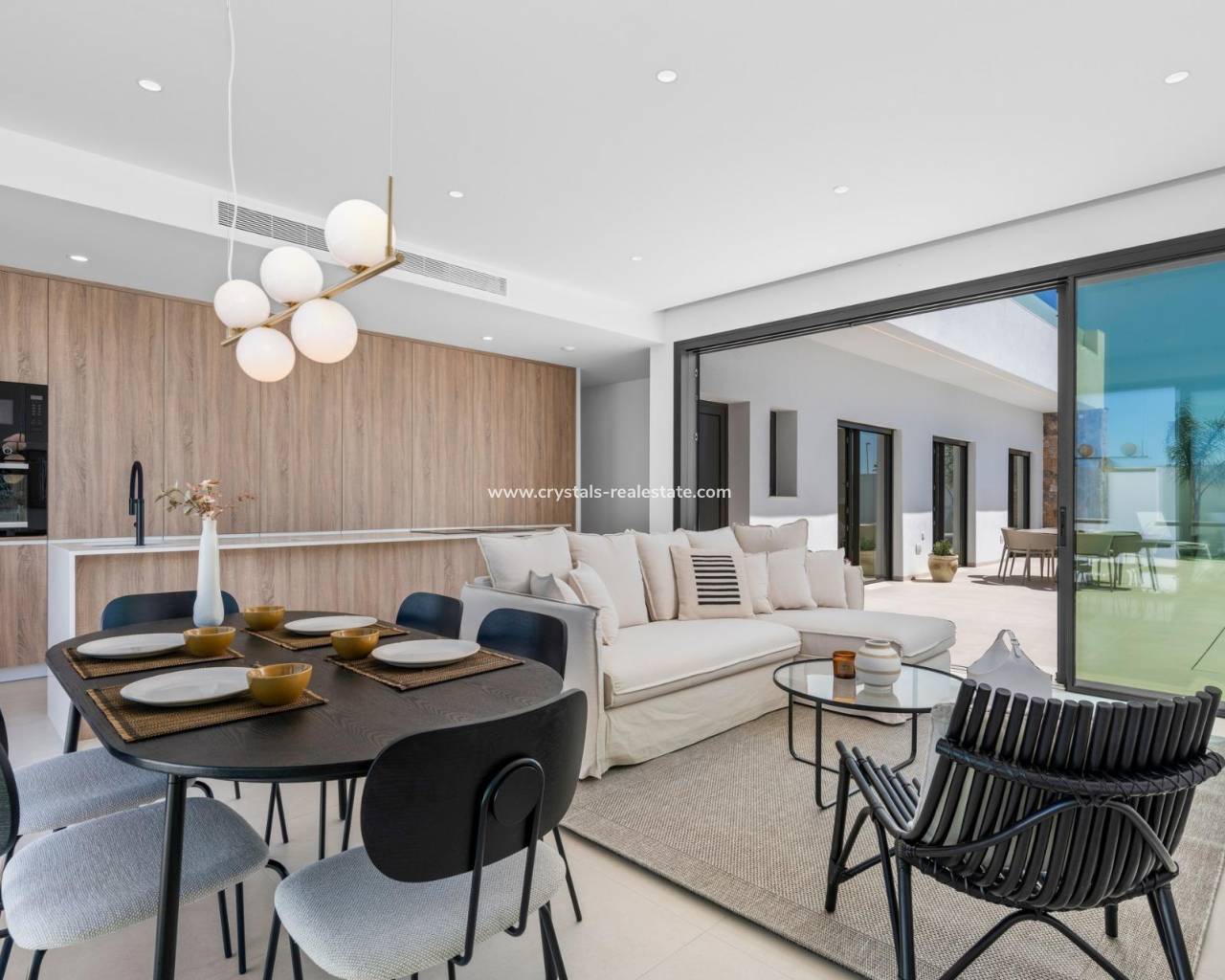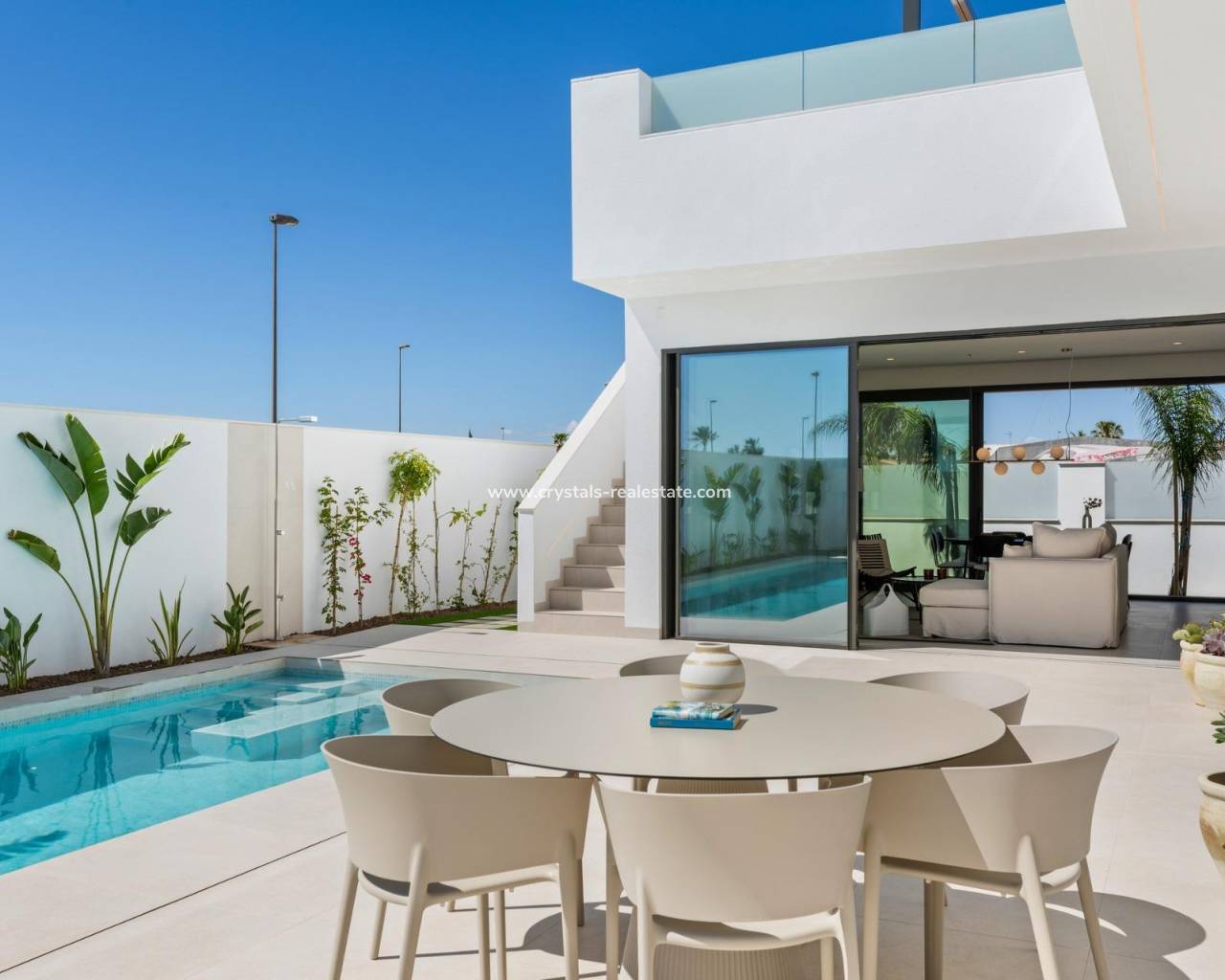 NEUBUGEHÄUSEN IN SAN JAVIER Neubauwohnanlage mit Villen in San Javier, 2,5 km vom Strand entfernt. Die Villen sind einstöckig und bestehen aus 3 Schlafzimmern, 2 Badezimmern und 1 Gäste-WC, einer amerikanischen Küche, einem Wohnzimmer mit freiem Blick auf die Terrasse, einem privaten Garten mit Swimmingpool und einer Sonnenterrasse. Die Küche ist komplett in weißem Hochglanz oder Holz eingerichtet und verfügt über ein Induktionskochfeld mit integriertem Dunstabzug, einen Backofen, eine Mikrowelle, eine Waschmaschine, einen integrierten Kühlschrank und einen integrierten Geschirrspüler. Komplette Installation einer Klimaanlage mit Luftkanälen. Der Pool verfügt über eine Vorinstallation für eine Wärmepumpe. San Javier liegt in der Nähe aller Dienstleistungen und bietet einfachen Zugang zum Strand, zu Wassersportmöglichkeiten, Geschäften und dem Verkehrsnetz. Hier können Sie alle Einrichtungen genießen, die San Javier zu bieten hat, wie lokale Geschäfte, Bars und Restaurants, und sind gleichzeitig in der Nähe von Einkaufszentren, dem Flughafen Murcia und all den schönen Orten entlang des Mar Menor. Der Flughafen Corvera/Murcia ist 30 Minuten und der Flughafen Alicante 45 Minuten entfernt.