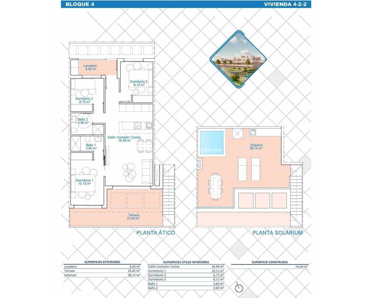 Nouveau développement exclusif à Pilar de la Horadada, Costa Blanca, Espagne Maisons modernes à proximité de la mer Découvrez ce nouveau complexe résidentiel à Pilar de la Horadada, un endroit privilégié sur la Costa Blanca. À seulement 2 km de la plage, ce projet offre une grande variété de propriétés de 3 chambres et 2 salles de bains, avec un parking privé inclus dans le prix. Le projet dispose de vastes espaces communs, dont une piscine commune, des jardins paysagers et une aire de jeux pour enfants, idéale pour toute la famille. Différentes typologies pour répondre à votre style de vie Ce lotissement offre différentes options de logement : Appartements au rez-de-chaussée avec jardins privés. Appartements à l'étage intermédiaire avec de grandes terrasses. Penthouses avec solarium privé. Bungalows au rez-de-chaussée avec jardin privé. Bungalows au dernier étage avec jardin privé et solarium. Maisons de ville et maisons jumelées avec jardin et solarium. Toutes les propriétés ont été conçues dans un style moderne et fonctionnel, avec des matériaux de haute qualité et des finitions contemporaines. Équipements et qualités Les propriétés sont équipées de : Pré-installation de l'air conditionné. Menuiserie extérieure en aluminium à rupture de pont thermique et double vitrage. Porte d'accès renforcée pour plus de sécurité. Système aérothermique pour une production d'eau chaude efficace. Armoires encastrées avec éclairage LED. Meubles de salle de bains et paravents inclus. Pilar de la Horadada : un lieu de vie privilégié Pilar de la Horadada est une ville côtière située à l'extrémité sud de la Costa Blanca, qui bénéficie d'un climat exceptionnel et d'une excellente qualité de vie. Sa rue principale, très animée, offre une grande variété de magasins, de supermarchés, de restaurants et de services essentiels. À 5 minutes en voiture, vous trouverez les superbes plages de Torre de la Horadada et de Mil Palmeras, avec du sable doré et une belle promenade. En outre, la région dispose de pistes cyclables, de sentiers de randonnée et de nombreuses activités sportives. Distances des points clés Terrain de golf Lo Romero - 5 km (10 minutes en voiture). Aéroport de Corvera (Murcie) - 40 km (40 minutes en voiture). Aéroport d'Alicante - 55 km (55 minutes en voiture). Centre commercial Zenia Boulevard - 15 km (15 minutes en voiture). Marina Torre de la Horadada - 3 km (5 minutes en voiture). Demandez plus d'informations dès aujourd'hui Ne manquez pas cette opportunité d'acheter une propriété neuve dans l'une des meilleures zones de la Costa Blanca. Contactez-nous dès maintenant pour plus de détails et pour organiser une visite.