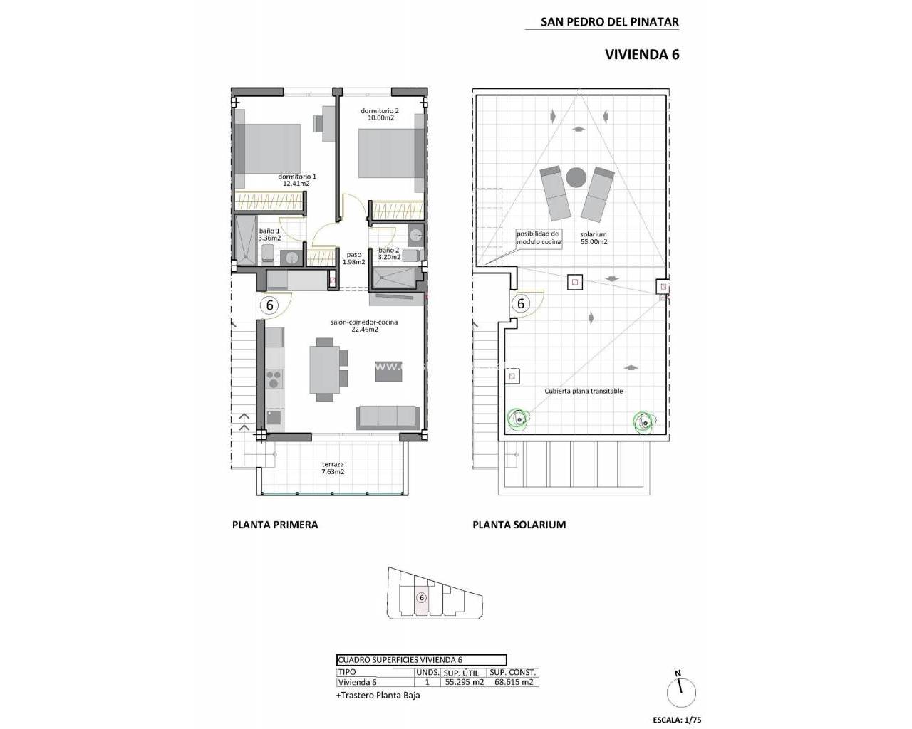 Bungalows nouvellement construits à San Pedro del Pinatar - Situation privilégiée à 500 m de la plage Maisons exclusives de style boutique près de la côte Découvrez ces élégants bungalows neufs au cœur de San Pedro del Pinatar, à seulement 500 mètres des superbes plages de la Mar Menor. Ce lotissement de charme ne comprend que huit maisons caractéristiques, alliant design moderne, confort et mode de vie côtier paisible. Modèles disponibles pour s'adapter à votre style de vie Modèle rez-de-chaussée/jardin : Ce modèle comprend une terrasse à l'avant et un patio spacieux à l'arrière, parfaits pour vivre à l'extérieur. Modèle Penthouse Loft : Comprend un solarium privé sur le toit et une terrasse avant, offrant des vues dégagées et une abondance de lumière. Détails du modèle rez-de-chaussée/jardin Entrez dans un espace de vie lumineux qui se connecte de manière transparente à la salle à manger et à une cuisine entièrement équipée. De grandes portes coulissantes en verre laissent entrer la lumière naturelle, créant une ambiance ouverte et accueillante. L'aménagement comprend deux chambres spacieuses, dont la chambre principale dotée d'une salle de bains attenante, ainsi qu'une salle de bains familiale moderne. Points forts du modèle Penthouse L'accès au penthouse se fait par un escalier privé menant à une grande terrasse. À l'intérieur, un salon et une salle à manger ouverts se mêlent à une cuisine entièrement équipée. Deux chambres à coucher sont incluses, la chambre principale disposant d'une salle de bains attenante. Un solarium privé sur le toit, accessible depuis la cuisine, constitue un endroit idéal pour se détendre ou se divertir. Des rangements supplémentaires au rez-de-chaussée assurent la commodité de l'ensemble. Principales caractéristiques et commodités Éclairage LED intérieur et extérieur. Cuisine entièrement équipée avec plaque de cuisson à induction, four, lave-vaisselle et réfrigérateur/congélateur. Climatisation installée. Place de parking réservée. Jardin commun paysager avec piscine pour les résidents. San Pedro del Pinatar : charme côtier et commodité Situé sur les magnifiques côtes de la Mar Menor et de la Méditerranée, San Pedro del Pinatar est un paradis pour les amateurs de sports nautiques, de voile et de plage. La région voisine de Lo Pagán offre des bains de boue naturels, des eaux calmes et des services tout au long de l'année, notamment des boutiques, des restaurants et des installations de loisirs. Distances des principaux centres d'intérêt : Centre commercial Dos Mares : Centre commercial Dos Mares : 5 km Aéroport de Murcia/Corvera : 30 km Aéroport d'Alicante : 75 km Terrains de golf locaux : 10-20 km Marina et clubs de voile : 2 km Réservez votre maison de rêve dès aujourd'hui L'achèvement des travaux étant prévu pour la fin de l'année 2025, c'est le moment idéal pour réserver votre nouvelle maison à San Pedro del Pinatar. Ne manquez pas cette occasion de profiter d'un mélange d'élégance moderne et de tranquillité côtière. Contactez-nous dès aujourd'hui pour en savoir plus ou pour organiser une visite !