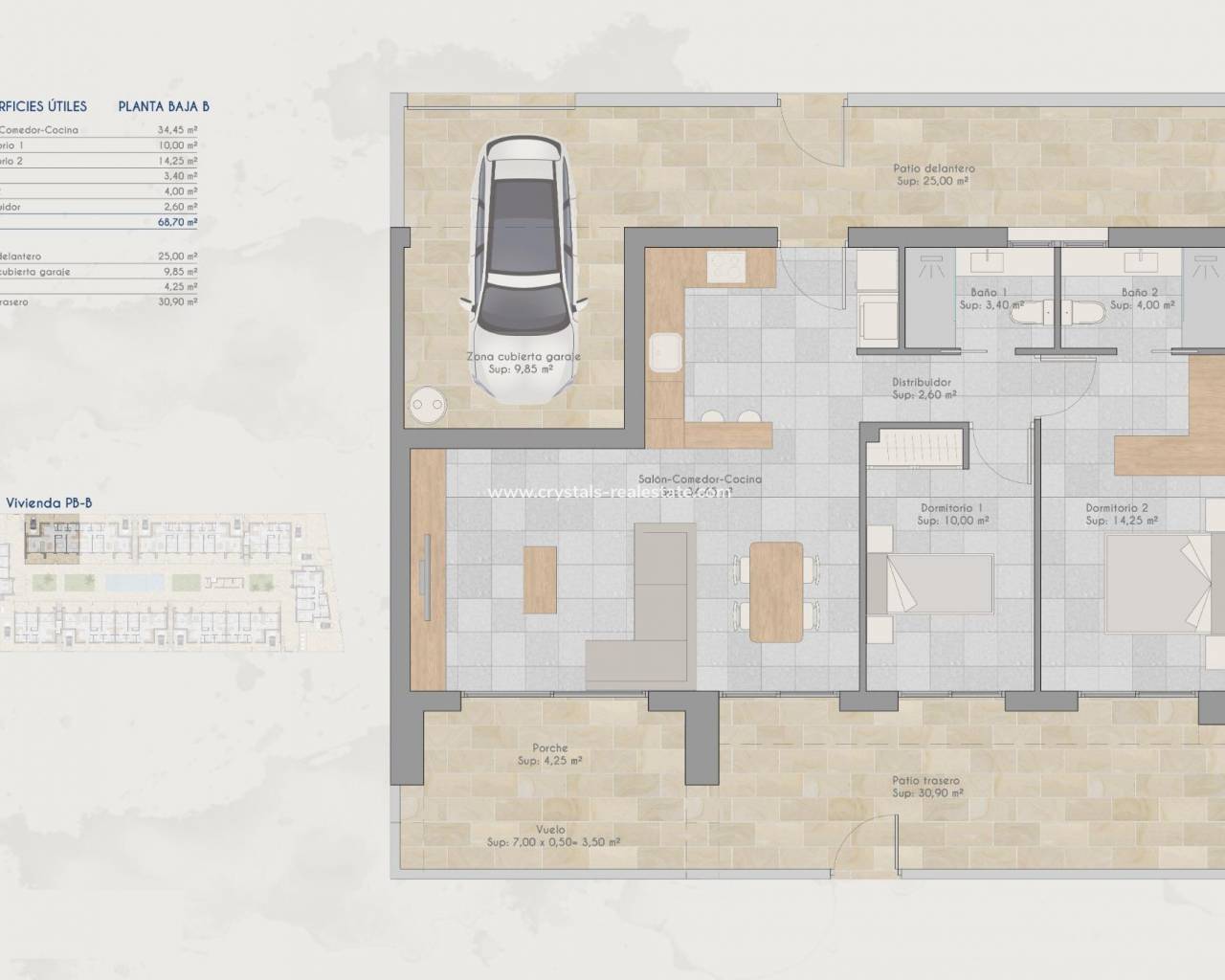 Nieuwbouwwoningen in Torre-Pacheco, Costa Cálida Moderne bungalows met uitzonderlijke kenmerken Ontdek een nieuw wooncomplex in Torre-Pacheco, met 24 stijlvolle bungalows met 2 of 3 slaapkamers. Kies tussen woningen op de begane grond met ruime terrassen of woningen op de eerste verdieping met privéterrassen en solariums. Elk solarium heeft een pergola, een barbecueplaats en een verstevigde dakbedekking, perfect voor het installeren van een jacuzzi. Alle woningen hebben een eigen parkeerplaats en volledig geïnstalleerde airconditioning, zodat je het hele jaar door verzekerd bent van comfort. Toplocatie in Torre-Pacheco Dit project ligt in het hart van Torre-Pacheco, vlakbij essentiële voorzieningen, zoals supermarkten, winkels, bars en restaurants. Het bruisende stadscentrum, met zijn charmante Spaanse sfeer, ligt op loopafstand. Voor strandliefhebbers ligt de prachtige Mar Menor op slechts 10 minuten rijden, met goudkleurig zand en kristalhelder water. Geniet van uitstekende gemeenschapsvoorzieningen Het complex beschikt over een prachtig aangelegde gemeenschappelijke ruimte met weelderige tuinen en een sprankelend zwembad, dat een sereen toevluchtsoord biedt om te ontspannen en tot rust te komen. Het zonnige klimaat in de omgeving, met gemiddeld 320 dagen zon per jaar, vult deze buitenruimtes perfect aan. Omringd door bekroonde golfbanen Torre-Pacheco is een paradijs voor golfers, omgeven door enkele van de meest gerenommeerde golfbanen in Spanje. Deze cursussen zijn slechts een klein eindje rijden, waardoor het een ideale locatie voor golfliefhebbers. Strategische verbindingen naar belangrijke bestemmingen Internationale luchthaven Murcia: 20 km (ongeveer 20 minuten met de auto). Treinstation: Op slechts 700 meter afstand, met handige reismogelijkheden. Winkelcentra: Verschillende grote winkelcomplexen binnen een straal van 15 km. Stranden: De prachtige stranden van de Costa Cálida liggen op slechts 10 km afstand. Havens en jachthavens: De dichtstbijzijnde jachthaven ligt op ongeveer 12 km afstand, perfect voor varen en watersporten. Een gezondere levensstijl wacht De regio Costa Calida staat bekend om zijn uitzonderlijke levenskwaliteit. Met een lage luchtvochtigheid, schone lucht en een subtropisch klimaat is dit een van de gezondste gebieden van Spanje. De perfecte combinatie van natuurlijke schoonheid, zeebries, en overvloedig zonlicht maakt Torre-Pacheco een zeer gewilde bestemming. Nu handelen om uw droomhuis veilig te stellen Mis deze kans niet om een modern huis op een toplocatie te bezitten. Neem vandaag nog contact met ons op voor meer informatie over deze ongelooflijke ontwikkeling of om een bezichtiging te plannen!
