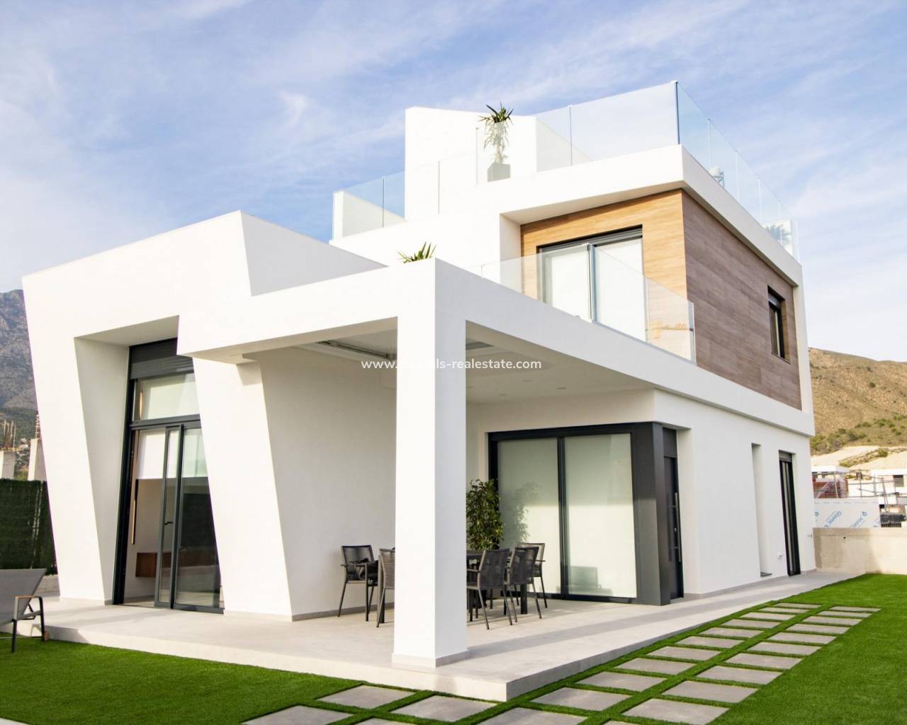 NIEUWBOUW VILLA'S IN FINESTRAT Nieuwbouwwijk van 22 villa's gelegen in Finestrat. Elke ochtend wakker worden met uitzicht op zee en de groene heuvels van de golfbaan ernaast. Geniet van het natuurlijke licht door de grote ramen en de uitstekende oriëntatie (lange gevel op het zuiden). De moderne villa heeft 3 slaapkamers, 3 badkamers, open keuken met ruime woonkamer, inbouwkasten, terras, solarium, privétuin met het zwembad en parkeerplaats. Jouw huis op maat Villa's is gebaseerd op het idee om je een huis te bieden dat is afgestemd op jouw behoeften. Daarom kan elk huis voor 100% op maat worden gemaakt. Ons team van architecten en binnenhuisarchitecten creëert elke ruimte naar jouw wens om je dromen waar te maken. De indeling van het huis aanpassen (binnen de toegestane bouwmogelijkheden). Voeg apparatuur toe aan je inloopkasten en vergroot de opslagcapaciteit en orde. Rond je tuingereedschap af zodat het het beste bij je wensen past (zwembad en buitenafwerking). Kies uit verschillende soorten sferen en afwerkingen naar jouw smaak. Finestrat is een droombestemming! Dit land wordt omringd door de zee, recht onder het majestueuze silhouet van de berg Puig Campana, naast de charmante historische wijk. Het is de perfecte bestemming voor wie op zoek is naar een ontspannen plek om te wonen zonder het comfort van alle diensten bij de hand te moeten opgeven. Finestrat heeft tal van vervoersmogelijkheden om je vrij te verplaatsen. Bus: De lijnen 14, 15 en 16 zijn beschikbaar om te reizen tussen Finestrat, Benidorm en Villajoyosa. Tram: Op de lijn die Alicante met Benidorm verbindt, vind je de halte La Marina - Finestrat winkelcentrum. De tram brengt je in slechts 1 uur naar het centrum van Alicante. Luchthaven El Altet (40 min): Deze luchthaven ligt op 40 minuten van Finestrat en er zijn vluchten naar het Verenigd Koninkrijk, België, Nederland, Milaan, Zürich en vele andere bestemmingen en talloze luchtvaartmaatschappijen om mee te vliegen. In Finestrat wordt u omringd door themaparken, waar u kunt genieten van de beste vrijetijdsactiviteiten binnen handbereik. Waar kinderen en volwassenen op avontuurlijke wijze leren over het milieu, de natuur en de geschiedenis. Terra Mitica (10 min): Terra Natura (10 min) Acuanatura (10 min): Dankzij het warme klimaat van de Levante kun je het grootste deel van het jaar genieten van de natuur en buitensporten. De natuurlijke landschappen en sportfaciliteiten die in Finestrat beschikbaar zijn, bieden een breed scala aan mogelijkheden om van de omgeving te genieten. Puig Campana Golf (1min): Een van de nieuwste en best uitgeruste sportfaciliteiten in de omgeving. Met zijn 9 holes kun je sporten en genieten van de beste sportomgeving tijdens de vele toernooien. Natuurpark Puig Campana (10 min): Wandelen vanaf Font del Molí langs de verticale kilometer naar het geodetische hoekpunt van Puig Campana is een onvergetelijke ervaring.