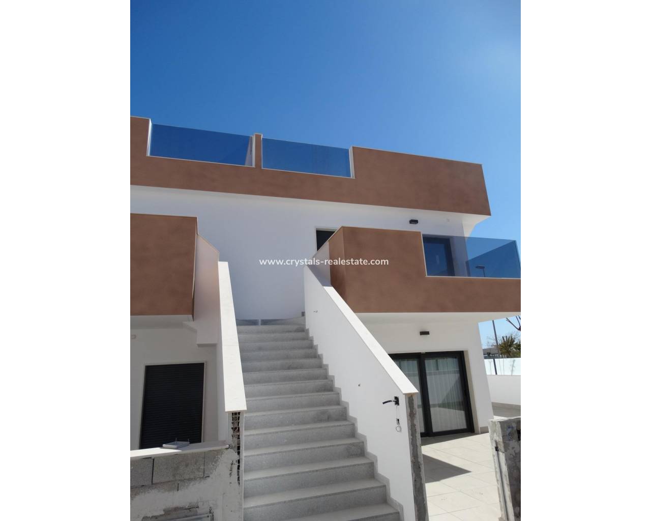 Newly Built Bungalows with Solarium or Garden in Pilar de la Horadada Modern Residential Development on the Southern Costa Blanca Located in the charming municipality of Pilar de la Horadada, this new residential development of bungalows offers a comfortable, Mediterranean lifestyle in one of the most attractive areas of the Costa Blanca. Pilar de la Horadada is known for its welcoming atmosphere, excellent climate and extensive sandy beaches such as Las Higuericas and Mil Palmeras, ideal for enjoying with the family or practising water sports. Layout and Types of Properties The complex consists of 28 modern bungalows available in 2 and 3 bedroom versions, distributed as follows: Ground floors with private garden Upper floors with private solarium and assigned storage room Many of the properties are south-facing, ensuring excellent natural light, and offer views of the communal pool or the adjacent park. Functional and well-equipped spaces Each property has been designed with spacious and functional spaces: Open-plan kitchen with large living-dining room Built-in wardrobes Private terrace in each unit Parking space included In addition, the properties feature: Hot water via aerothermal system Pre-installation of air conditioning PVC exterior carpentry with double glazing and aluminium shutters Bathroom furniture included Communal Areas and Natural Environment The residential complex includes a communal swimming pool surrounded by green areas, perfect for enjoying the sun and tranquillity. Just 4 km from Las Higuericas Beach, it can be easily reached on foot or by bike along the pleasant promenade that connects to the sea. Excellent location and connectivity The location of the residential complex allows access to all kinds of services and points of interest: Supermarkets, shops, bars and restaurants less than 1 km away Golf courses such as Lo Romero 6 km away Dos Mares shopping centre 11 km away Mil Palmeras and Torre de la Horadada beaches just 5 minutes away Murcia (Corvera) airport 40 km away Alicante Airport 65 km away Your New Life in the Sun This residential development in Pilar de la Horadada represents an excellent opportunity to enjoy Mediterranean living in a modern and well-located property. Contact us today for more information or to arrange a viewing and take the first step towards your new home on the Costa Blanca.