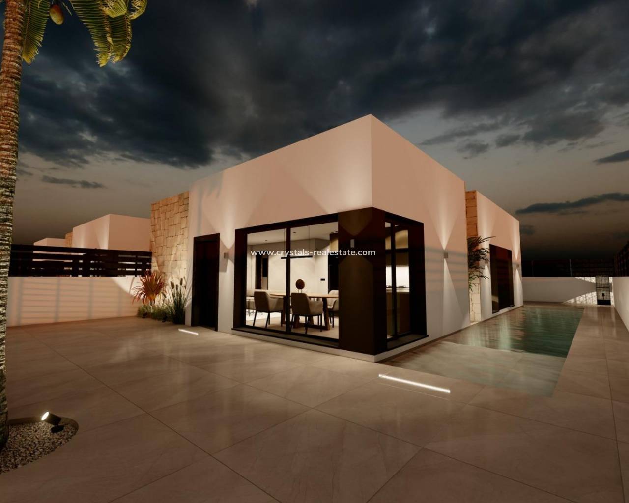 Modern Independent Villas in Monteazul Benijofar with Optional Pool and Solarium Prime Location Between Benijofar and Ciudad Quesada These modern independent villas are located in the sought after Monteazul urbanization, a peaceful residential area situated between Benijofar and Ciudad Quesada. The neighborhood offers an excellent balance between comfort, tranquillity and convenience, with bars, restaurants, supermarkets and essential daily services just a short walk away. The beautiful beaches of Guardamar del Segura are approximately 9 km from the development, while Alicante International Airport lies around 38 km away. Golf enthusiasts can enjoy La Marquesa Golf at just 5 km and Vistabella Golf at 14 km. The marina of Torrevieja is located about 14 km from the villas. Stylish Single Level Living Each villa is thoughtfully designed on one floor, offering a practical and comfortable layout perfect for both holidays and year round living. The homes feature 3 bedrooms and 2 bathrooms, including a master bedroom with an ensuite bathroom and a spacious walk in wardrobe. A separate laundry room and private parking space on the plot add extra convenience. High Quality Interiors and Modern Features The villas include fitted bathrooms with furniture, mirror and shower screen. Additional features include ducted air conditioning pre installation, fully furnished kitchens and motorized shutters in all bedrooms, ensuring comfort and modern functionality in every space. Optional Private Pool and Solarium Buyers have the option to add a private swimming pool or a rooftop solarium for an additional cost, allowing you to customize your outdoor living area and enhance your Mediterranean lifestyle. Excellent Connectivity and Tranquil Surroundings Situated in a quiet new residential area, the villas offer easy access to the AP7 motorway, connecting you quickly to nearby coastal towns, marinas, golf courses and shopping areas. This enviable location makes the development ideal for those seeking a relaxed lifestyle close to both inland amenities and coastal attractions. Contact us today to arrange a viewing and secure your new home in Benijofar.