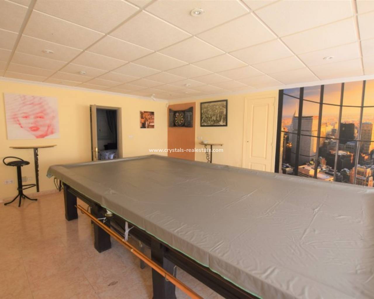 This superb large classic style villa is presented for sale in excellent condition and has been maintained to a very high standard. Situated in the popular Pueblo Bravo área of Quesada the property is positioned perfectly, south facing on a 1300m2 plot with views to the lakes and onto the sea. The large plot is divided into a selection of recreational and seating áreas with a large private swimming pool, terraces covered and open, jacuzzi spa, games área and a large detached garage. There is a fully equipped out door courtyard bar/ kitchen facility with some covered and open áreas complete with large dining table etc. The property offers a very large family home with 5 bedrooms, 6 bathrooms with a games lounge all distributed over three floors. On the ground floor facing the pool terrace is a self-contained apartment with lounge, kitchenette and bathroom. There is a door leading to a very large gaming área with full size snooker table and a further room with gaming equipment and pool table. There is also a toilet and shower room attached. An external staircase leads to the main floor of this villa. Entrance is via a very large glazed terrace/ lounge área over looking the gardens and pool. Once inside there is a very large lounge with feature fire place, seperate dining área, seperate kitchen and utility área. There is a door that leads to two large double/ triple bedroom complete with ensuite bathrooms. A closed in staircase leads up to the third floor where there are additional two large bedrooms and clssic style bathrooms patio doors from both bedroom open onto a shared terrace with exceptional views to the lakes. Viewing is highly recommended as there are so many extras included in the superb detached large property