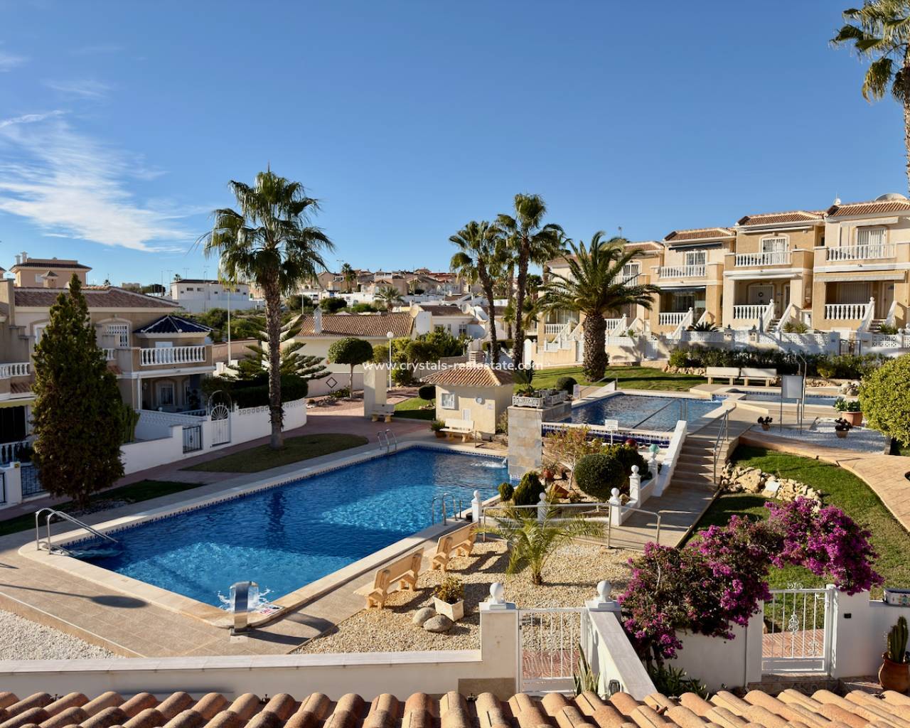Semi-Detached Villa for Sale in La Fiesta, Ciudad Quesada – Costa Blanca South This beautifully presented semi-detached villa is located in Conjunto Sofia, La Fiesta, Ciudad Quesada, Rojales, a highly desirable residential area on the Costa Blanca South. The property offers 90m² of built space on a generous 300m² plot, providing excellent indoor and outdoor living. Inside, the villa features 3 spacious bedrooms with fitted wardrobes and 2 bathrooms, including an ensuite bathroom. The bright open-plan living and dining area connects seamlessly with a modern open-style kitchen, fully equipped with white goods and direct access to a glazed terrace and rear patio—perfect for year-round enjoyment. The outdoor space is designed for easy maintenance and includes street parking, attractive garden areas, and access to a private solarium with lovely garden and pool views. The villa is west-facing, ensuring plenty of afternoon and evening sunshine. The property is part of a secure, gated complex with a well-maintained communal swimming pool and sunbathing areas, making it ideal as a permanent residence, holiday home, or rental investment. The home is presented in excellent condition and includes air conditioning and ceiling fans for year-round comfort. Prime Location – Ciudad Quesada, Rojales Ciudad Quesada forms part of the municipality of Rojales in the southern province of Alicante. It is located just 10 minutes from the Mediterranean beaches, approximately 8 km north of Torrevieja, and close to popular villages such as Benijófar, Benimar, and Formentera del Segura. Golf, Beaches & Transport Links La Marquesa Golf: 10 minutesLa Finca Golf (Algorfa), Las Ramblas Golf, Royal Campoamor Golf: short driveBlue Flag beaches of Guardamar del Segura, La Mata & Torrevieja: 10 minutesAlicante Airport: approx. 40 minutesMurcia Airport: approx. 45 minutes The area offers spectacular views of mountains, countryside, and salt lakes, with easy access to cultural destinations such as Elche, Murcia, and the beaches of La Manga del Mar Menor.