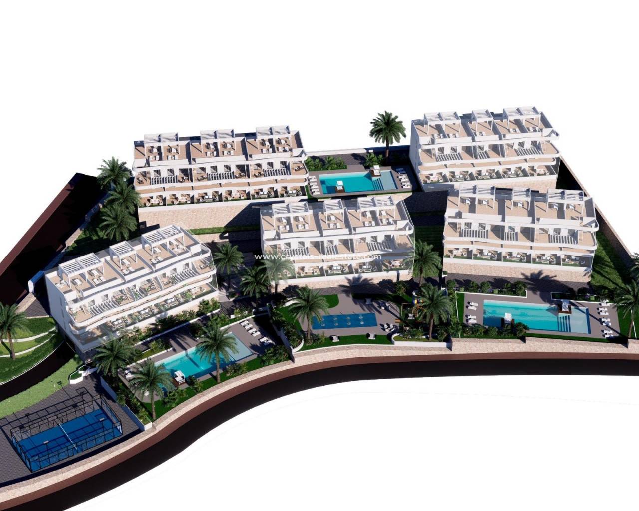 NEW BUILD RESIDENTIAL COMPLEX IN FINESTRAT New Build residential complex in Balcon de Finestrat. This complex of modern apartments with 2 bedrooms, 2 bathrooms, open plan kitchen with the living area. Some of the apartments will have sea views. Ground floor apartment with a private gardens, middle floor apartments with the terraces and top floor apartments has a terraces and private solariums. Each property has private underground parking space. The properties have access to the communal area with 3 swimming pools, parking, paddle, playground, calisthenics. It is a great opportunity and privilege to be able to live with this environment of golf and beach, close to all amenities of all services considered one of the best places to invest. Finestrat located in the Marina Baixa region of the Costa Blanca. Benidorm is just a five-minute drive from the properties and offers all the services you would need including shops, bars, restaurants, supermarkets, banks, pharmacies and several private international schools. Close to the beaches of Levante, Poniente and Cala de Finestrat, with more than 6km in length that are among the best in Europe awarded by the European Union with Blue Flags. All leisure services such as the theme parks of Aqua Natura, Terra Mítica, Terra Natura, Aqualandia and Mundomar, Sierra Cortina and Villaitana Golf courses, hiking and climbing in Puig Campana an incomparable natural setting or enjoy of nautical sports. Distance to the sea 4 km, to the airport 26 km and to the golf 1km.